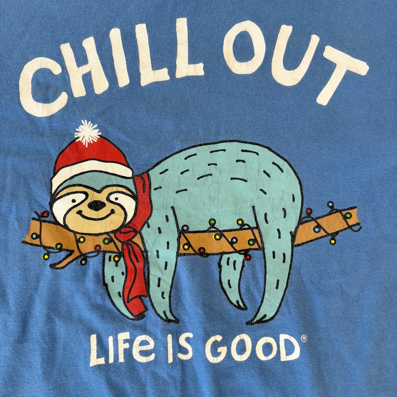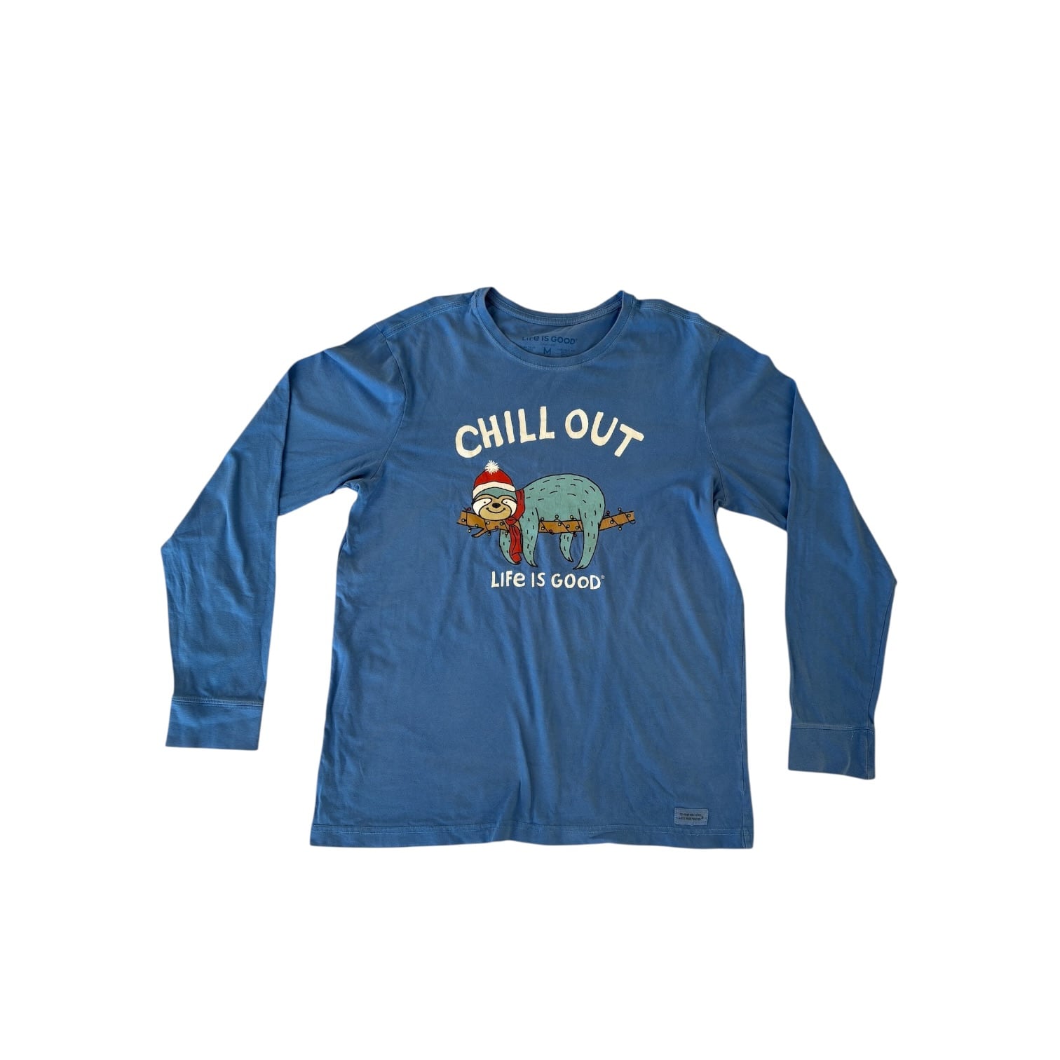 やわらかなブルーボディに、“CHILL OUT”のメッセージと、枝の上でくつろぐナマケモノのグラフィックを落とし込んだロングスリーブTシャツ。