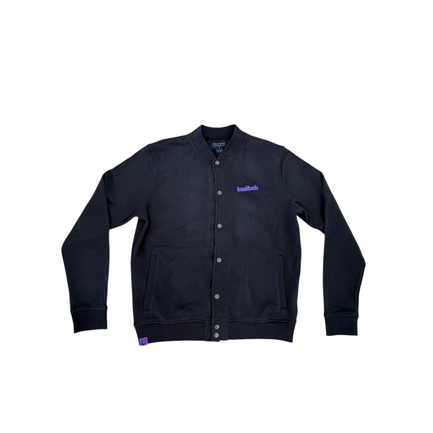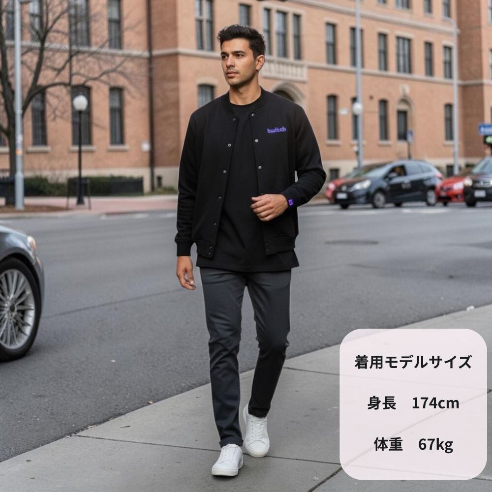 ブラックボディに、胸元のTwitchロゴがさりげなく映えるスタジャン型のスウェットジャケット。