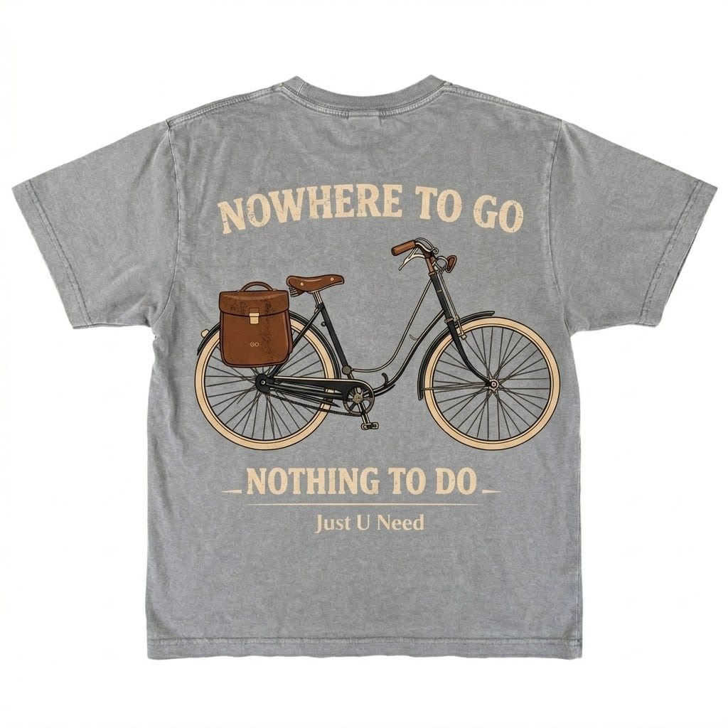 「JUST U NEED」が贈る、静寂と自由を纏う一着。背面に描かれたクラシックな自転車のグラフィックは、都会の喧騒から離れたEssentialな時間を表現しています。「NOWHERE TO GO, NOTHING TO DO」というメッセージは、地方での生活のリアルを言葉で表現しました。ヴィンテージアイスグレーの絶妙な掠れ感(Vintage Wash)が、長年着込んだようなビンテージな風合いを演出し、地方のライフスタイルに馴染む洗練されたトーンに仕上げました。日常を丁寧にアップデートする、ブランドの哲学を象徴するプロダクトです。