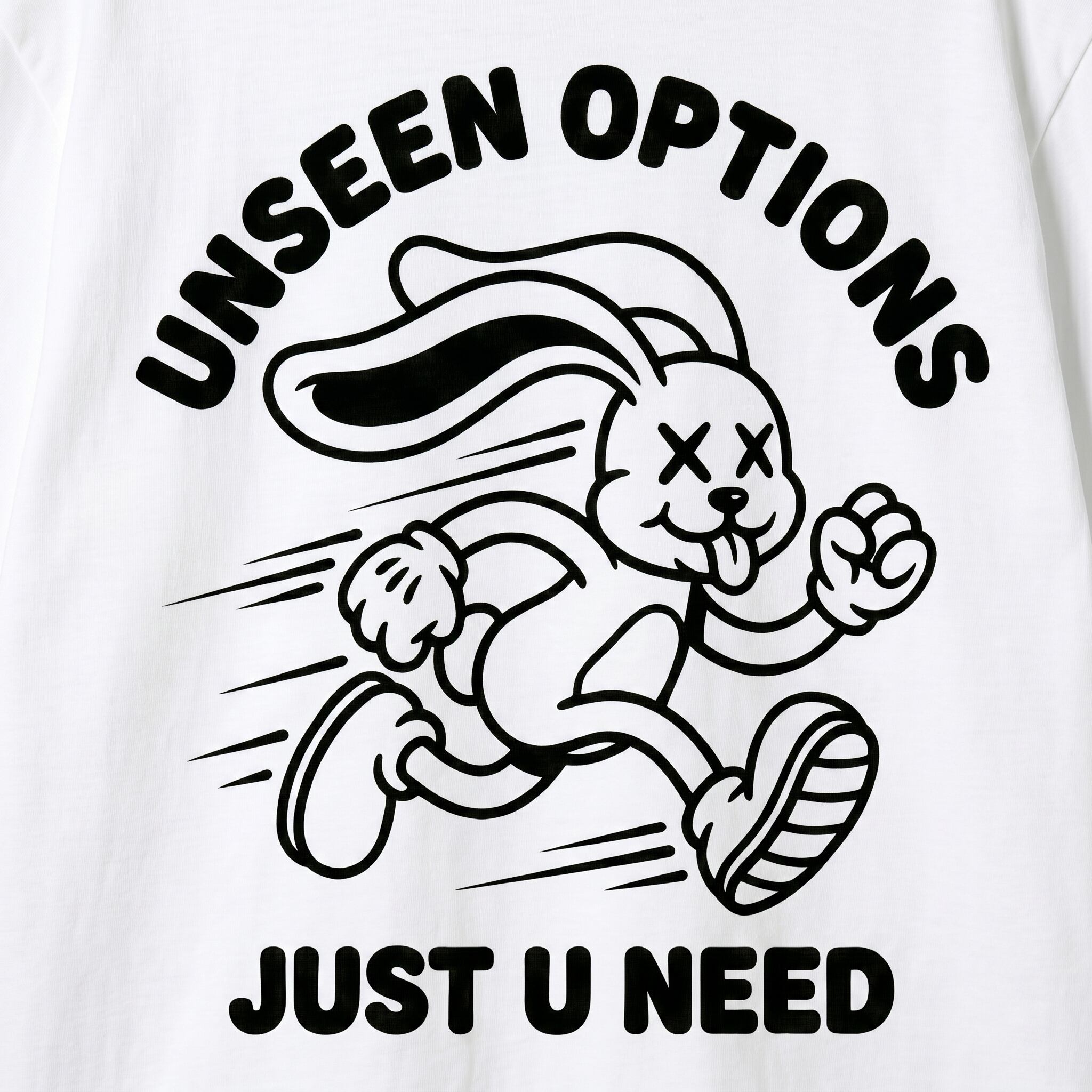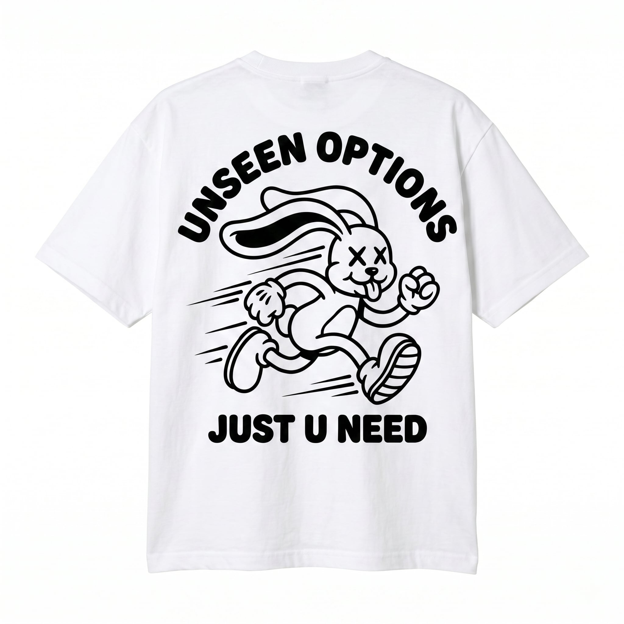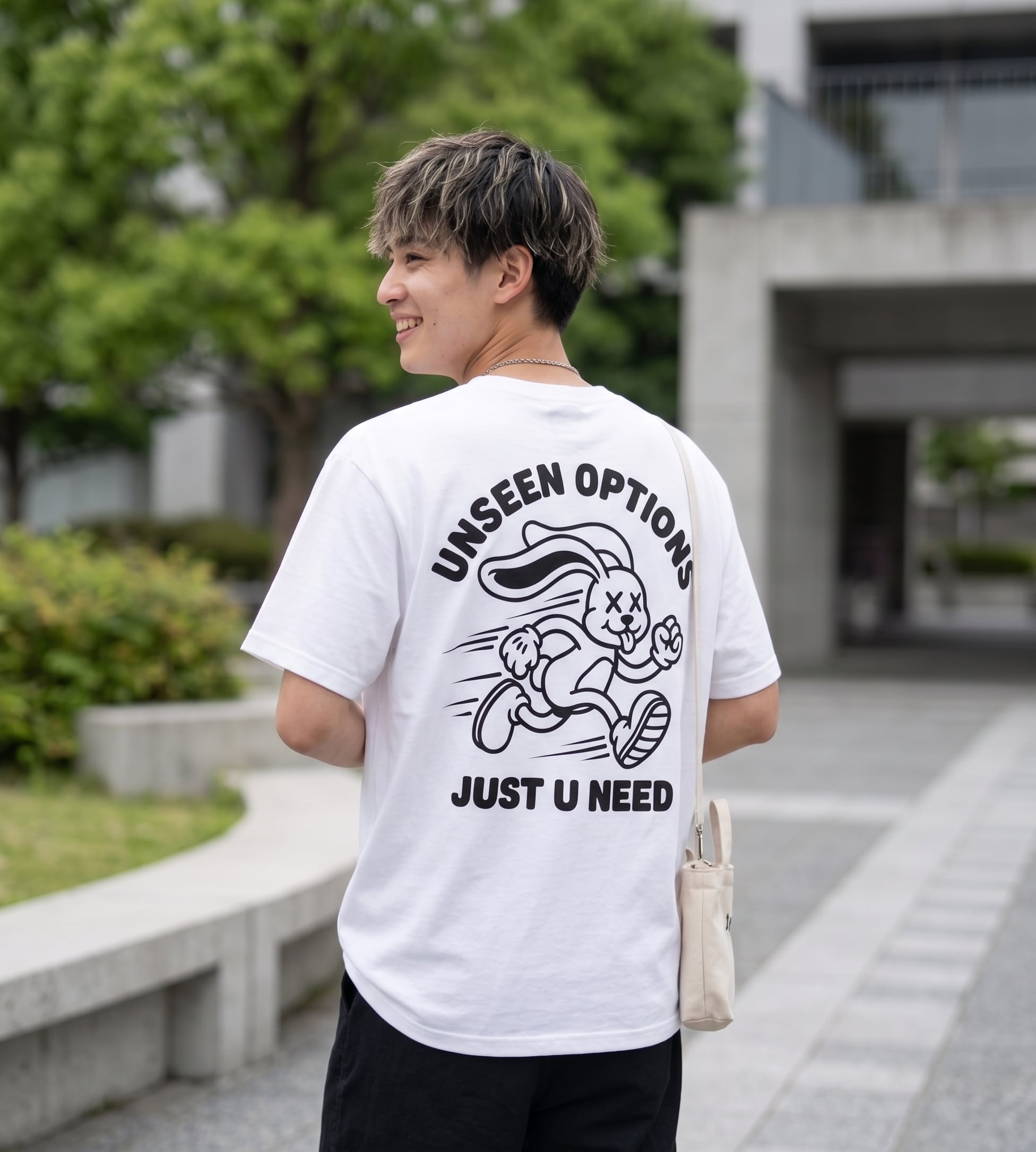 都会の喧騒の中に潜む、まだ見ぬ選択肢を。JUST U NEEDが提案する「Unseen Options Oversized Tee」は、日常に潜む無限の可能性を感じさせる一着です。フロント左胸には、あなた自身(You)、そして気づかれなかった内なる声(U + Ear = Rabbit)を象徴する、遊び心あふれるグラフィックをワンポイントで配置。背面には、大胆に駆け抜ける「×目」のうさぎが、諦めずに自分を表現し続けることのメッセージを伝えます。このOversizedシルエットは単なるトレンドではなく、自由な思考を象徴するスタイル。日々のコーディネートに新しい視点を取り入れ、日常をアップデートしてみませんか。
